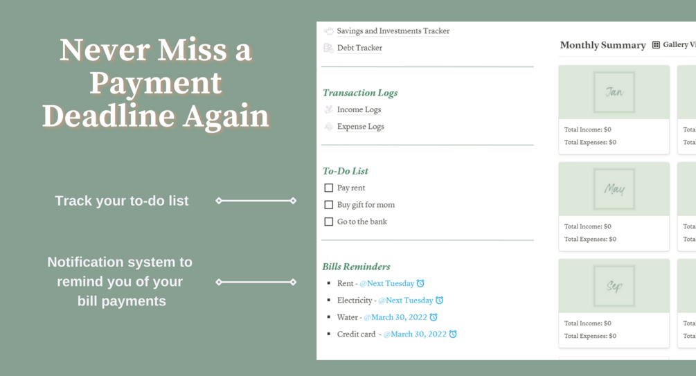 Manage and control where your money goes with this complete, fully automated budget and finance planner for Notion! Reaching your saving and investment goals is made easier with progress trackers and income/expense logs one click away. A comprehensive instruction manual and walkthrough video is provided so even Notion beginners can follow along!