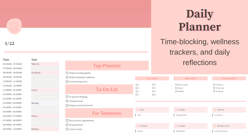 Complete, all-in-one Notion planner to help you organize and stay on track of your daily tasks and routine. This template is thoughtfully designed for everyday life. All you need to do is download and you’re ready to kickstart your productivity journey! A comprehensive instruction manual and walkthrough video is provided so even Notion beginners can follow along!